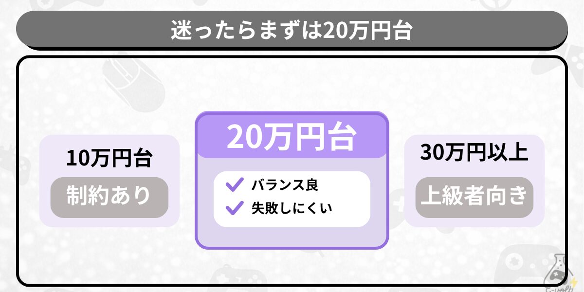 この記事では、初心者が最も後悔しにくい価格帯である「20万円台のゲーミングPC」 に絞って、